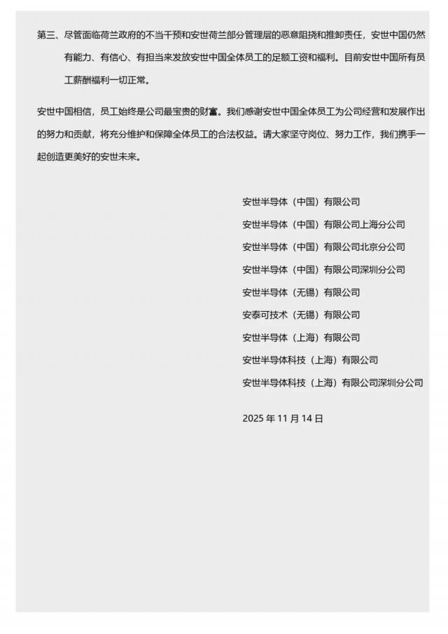 大家好!相信大家已经看到 2025 年 11 月 12 日以安世荷兰临时首席执行官 Stefan Tilger 名义发出的致安世中国全体员工信。该信函枉顾事实,试图混淆视听,充分反映出安世荷兰部分管理层推卸责任,置安世中国全体员工切身利益于不顾的态度。公司理解该信函会给大家带来困惑,为此,特向大家作如下说明,以正视听: